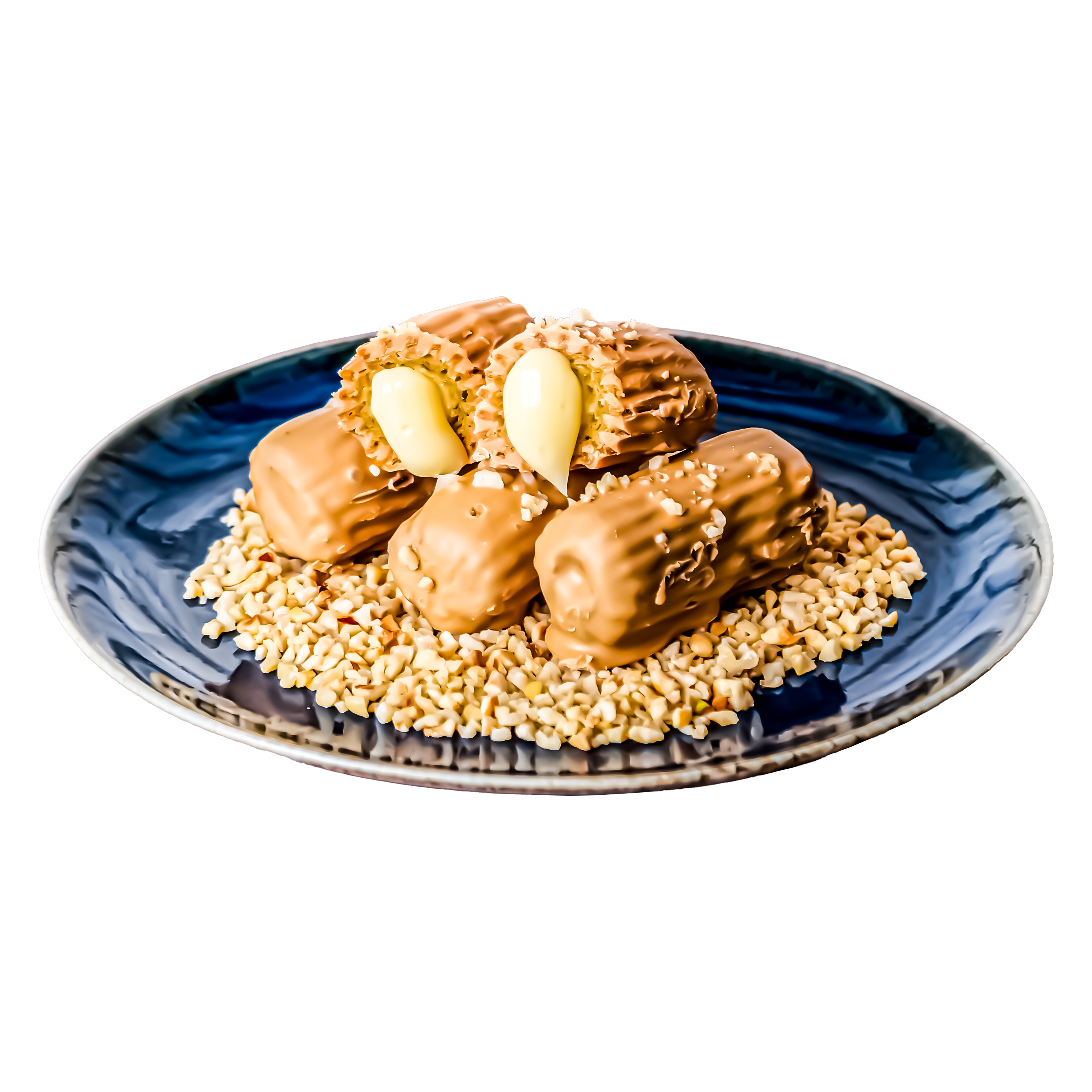 İçi vanilya dolgulu, dışı gold çikolata kaplı şerbetsiz tulumba.