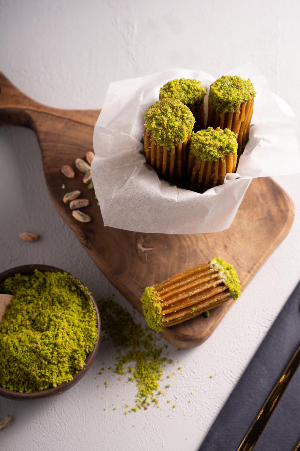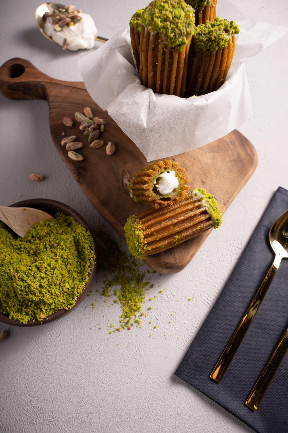 Özel bir kalıpla ürettiğimiz Antep fıstıklı tulumbamıza, kahvaltılık süt kaymağı enjekte ederek Kaymak Dolgulu tulumbayı elde ettik.